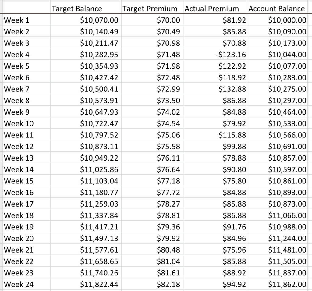 For week 24 I collected $94.92 in net premiums. My target for 24 is $82.18. My total net premiums collected for the first 24 weeks is $1,983.20 (19.83%). The target for my first 24 weeks is $1,822.44. Here is a screenshot of my positions at the end of the week along with the weekly summary: