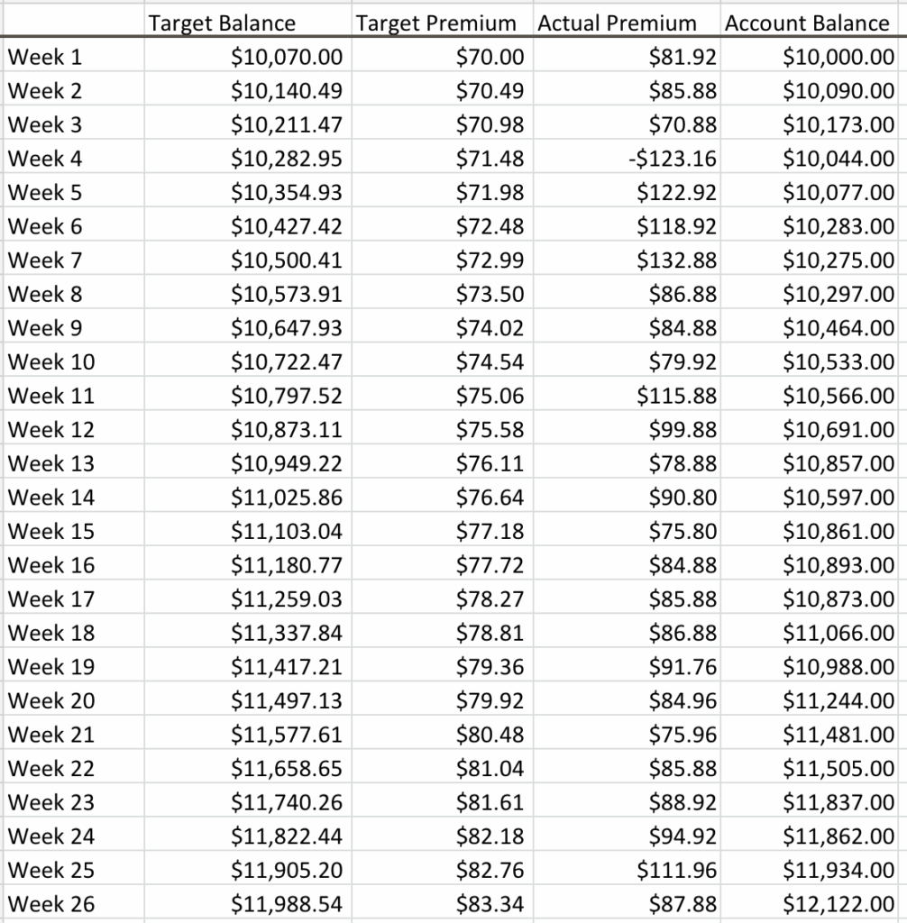 So for the week I collected a total of $87.88 in net premiums. My target for week 26 is $83.34. For the entire first 26 weeks I’ve collected a total of $2,183.04 in net premiums. My target for the first 26 weeks is $1,988.54.