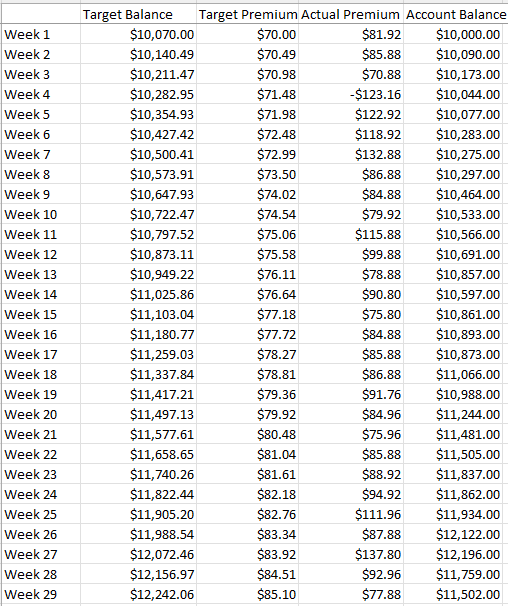 I collected a total of $77.88 in net premiums for the week. My target for week 29 is $85.10. Total premiums collected for the first 29 weeks is $2,491.68 and my target premiums for the first 29 weeks is $2,242.06. This still puts me at about $250 ahead of my target as far as premiums collected is concerned.