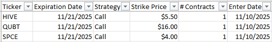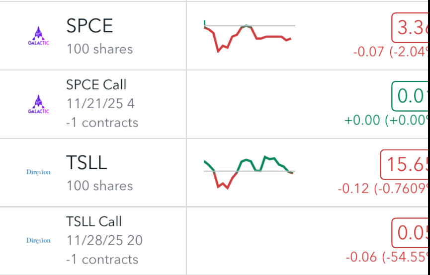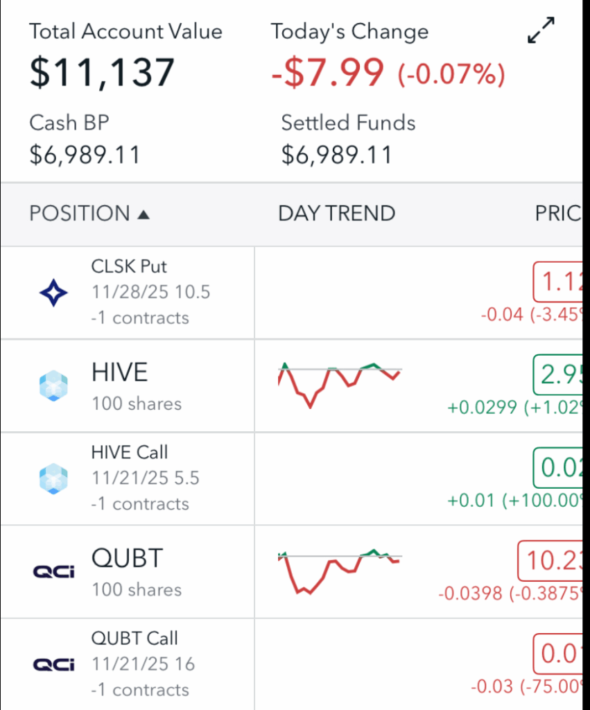 I was also holding 100 shares each of HIVE, QUBT, SPCE and TSLL. So on Monday morning I started by selling a $20 strike call on TSLL expiring 11/28 (11 DTE). I was able to collect a premium of $30 for this trade.