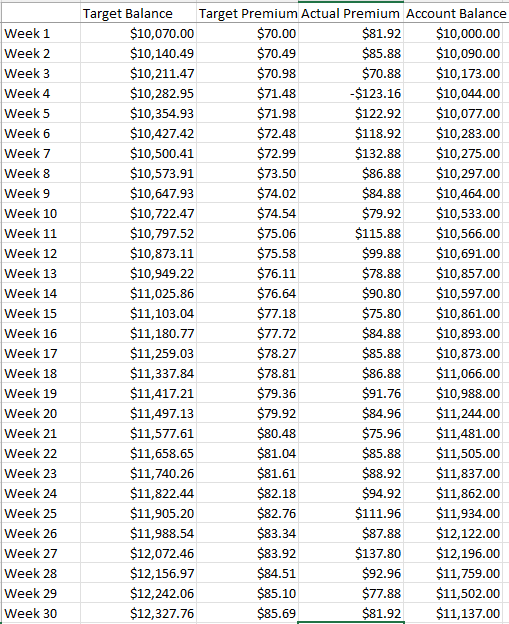 For week 30 I collected a net premium of $81.92. My target for week 30 is $85.69. For the first 30 weeks I’ve collected a total of $2,573.60 in net premiums and my target for the first 30 weeks is $2,327.76.