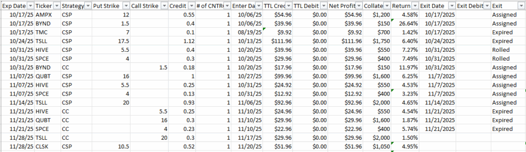 I decided to wait to see what direction the market was going in as the week progressed. On Thursday I opened a new position by selling a put on CLSK with a strike price of $10.50 and expiration of 11/28 (8 DTE). For this trade I collected a premium of $52. Below is the list of my trades for October and November so far.